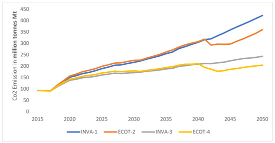 Figure 7 displays emissions from the power sector under renewable energy scenarios. Emissions under the baseline (INVA-1) scenario increase from 93 Mt in 2015 to 423 Mt in 2050, while the increase is capped at 360 Mt for the ECOT-2 scenario, with averages of 199 Mt, 268 Mt, and 317 Mt for the periods between 2021 and 2030, 2031 and 2040, and 2041 and 2050, respectively. However, with renewable energy policies in place, emissions increase slower than the baseline scenario. Under INVA-3, emissions only increase from 93 Mt in 2015 to 243 Mt in 2050, with an average of 178 Mt compared to 246 Mt in the BaU scenario, while ECOT-4 projects the best in terms of emissions trajectory at 173 Mt by 2050.