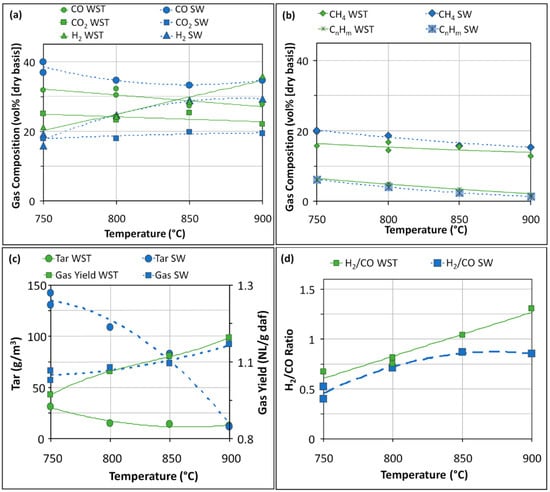 The two technical lignins used in this work were provided by two biorefineries, and their compositions are depicted in Table 1, Section 2.1. The gasification temperatures of SW and WST varied between 750 and 900 °C and the ER and S/L ratios were selected as the optimal conditions for WST gasification (ER = 0.13 and S/L ratio = 0.35 g/g(daf)) [4]. The results obtained in SW and WST gasification under different temperatures are compared in Figure 2.