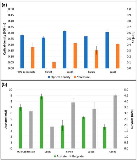 Optical density and pressure variation (ΔP) (a), and acetate and butyrate production (b) by B. methylotrophicum at 72 h while growing from syngas in the absence or presence of syngas condensates Cond3 to Cond6, obtained during the gasification of WST using different catalysts.