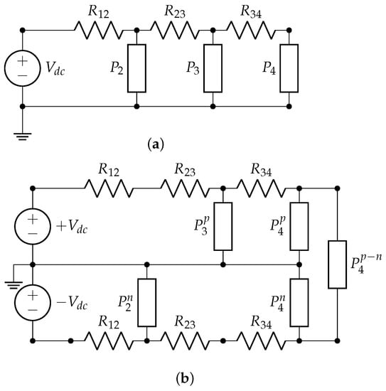 Figure 1 presents a comparison between the monopolar and bipolar DC configurations [9]. Figure 1a denotes a monopolar DC configuration, where it has been assumed that all the nodes with constant power terminals are solidly grounded (the most common assumption in the literature for monopolar DC configurations [10]). On the other hand, Figure 1b shows a possible configuration of constant power loads in a bipolar DC grid configuration, where the neutral wire is assumed to be solidly grounded [11]. However, for bipolar DC networks, the neutral wire can also operate under floating conduction in all the nodes except for the substation bus [12].
