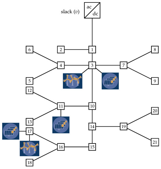 The schematic single-line diagram of the 21-bus grid is presented in Figure 3. Note that, in order to illustrate the connection of the dispersed generation sources to the positive pole in the 21-bus grid, photovoltaic generation sources are employed; and in the case of dispersed generators connected to the negative pole, wind power sources are used.