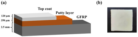 The GFRP substrates were cleaned using acetone and their thicknesses were measured with a digital micrometer screw gauge. The bilayer coating technique was adopted to develop PU-based composite coatings. The base layer was the body filler layer. Polyester-based body filler putty was used to reduce the pinholes and other surface irregularities present on the substrate. The body filler putty was applied using a putty blade in accordance with the instructions from the manufacturer. The surfaces were polished with 200 and 800 µm emery paper after 30 min of curing for better finishing. The average thickness of the body filler layer after emery was 350 µm. The top layer was a protective composite PU layer with CMP and CMF as reinforcing fillers. Figure 1a depicts a schematic representation of coating layers. CMP and CMF were mixed with water and stirred at 400 rpm for 2 h followed by addition to the water-based PU resin in three different weight ratios of resin to filler: 10:1, 10:0.5, and 10:0.2. A topcoat layer of cellulose-reinforced PU was sprayed with a Pilot Type-64 gun. The coated samples were cured for 24 h under ambient conditions. A digital micrometer screw gauge was used to measure the thicknesses of the coatings. The average thickness of the topcoat was 120 µm. Figure 1b represents a typical image of the as-prepared coating. The composite coatings developed with CMP and CMF are termed PUCMP and PUCMF, respectively.