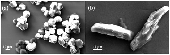 Figure 3 represents FESEM images of CMP and CMF microstructures. Figure 3a displays a spherical morphology of cellulose microparticles of ~10 µm in size. The cellulose microparticles appear to be highly agglomerated. Figure 3b confirms the fiber-like morphology of CMF, having a width of 10 µm and average length of 40 µm.