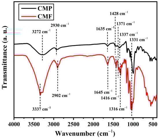 The FTIR spectra of CMP and CMF are shown in Figure 4. Intense broad peaks observed at 3272 and 3337 cm−1 in CMP and CMF spectra, respectively, are due to the hydrogen bonded –OH vibration of the cellulose [29]. This includes inter- as well as intra-molecular hydrogen bond vibration in cellulose [30]. Other characteristic peaks at 2930 and 2902 cm−1 belong to the C–H stretching vibration from the CH2 group of cellulose [29]. Peaks located at 1635 and 1645 cm−1 correspond to the vibration of water molecules in moisture absorbed by CMP and CMF [29]. Peaks found at 1428 and 1416 cm−1 are associated with CH2 scissoring, while peaks at 1337 and 1316 cm−1 represent the OH bending vibration of cellulose [31]. The peak located at 1371 cm−1 is attributed to the C–H asymmetric deformation of cellulose [32]. The IR bands in the region of 1000–1200 cm−1 are related to C–O–C stretching and CO vibrations. The peak at 1031 cm−1 in the FTIR spectrum corresponds to the C–O–C pyranose ring skeletal vibration of cellulose in CMP and CMF, respectively [33].
