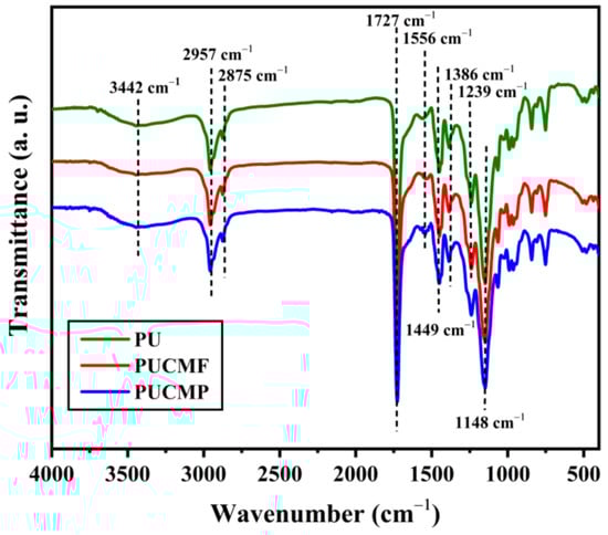FTIR spectra of PU, PUCMP (10 wt.%), and PUCMF (10 wt.%) coatings.
