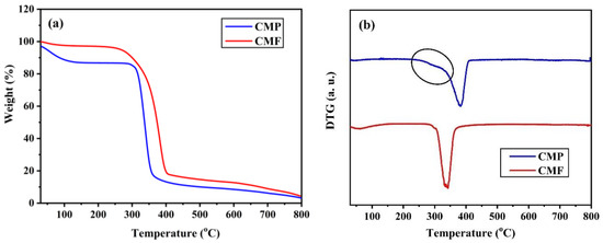 The TGA and DTG thermograms of CMP and CMF are shown in Figure 6. The TGA results of CMP and CMF are illustrated in Figure 6a. It shows that the thermal degradation of CMP and CMF occurs in two steps. Both samples demonstrate initial weight loss started around 100 °C, which is due to the evaporation of moisture in the cellulose samples. In the case of CMP, weight loss due to the evaporation of moisture is greater than that for CMF. Fast pyrolysis occurs at temperatures ranging from 250 °C to 350 °C. The subsequent weight loss is rapid, owing to cellulose dehydration and breakdown. The temperature at which the oxidation process begins is known as the onset decomposition temperature. The onset temperature of CMP is higher than that of CMF, being 289 °C versus 243 °C, respectively. As a result of oxidative thermal degradation and the breakdown of the crystallite structure, cellulose and regenerated cellulose are completely burned during this stage. Figure 6b shows the DTG curves of CMP and CMF samples. It is observed that the DTG curve of CMP is shifted to a higher temperature than CMF. DTG peaks occur at 382 °C for CMP and 340 °C for CMF. This higher decomposition temperature can be attributed to more order and packing of the cellulose region as well as higher hydrogen bond intensity [35]. Furthermore, the DTG curve of CMP displays a shoulder between 260 and 320 °C encircled in the figure. This can be related to degradation of hemicellulose in CMP. In a work of Yang and co-authors, it has been revealed that hemicellulose exhibits more prominent decomposition between 220 and 315 °C [36].