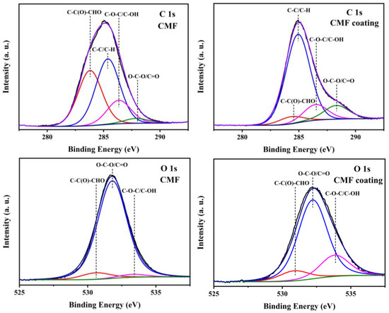 C 1s and O 1s core level spectra of CMF and CMF coating (PUCMF 10 wt.%).
