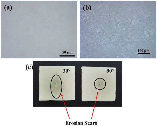 Optical microscopic images of PUCMF 5 wt.% coating: (a) as-prepared (b) after SPE test, and (c) images of erosion scars at 30° and 90° erodent angles.
