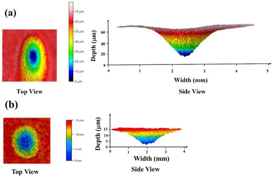 Three-dimensional top views and side views of erosion scars of PUCMF 5 wt.% coating for (a) 30° impact angle and (b) 90° impact angle.