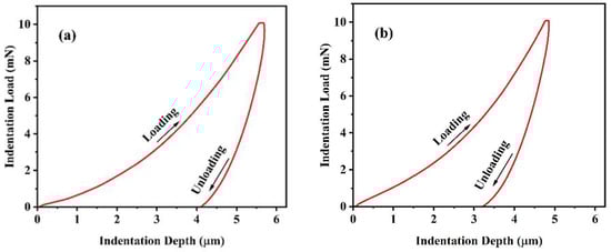 Nanoindentation loading–unloading curves of (a) PUCMP 5 wt.% and (b) PUCMF 2 wt.% coatings.