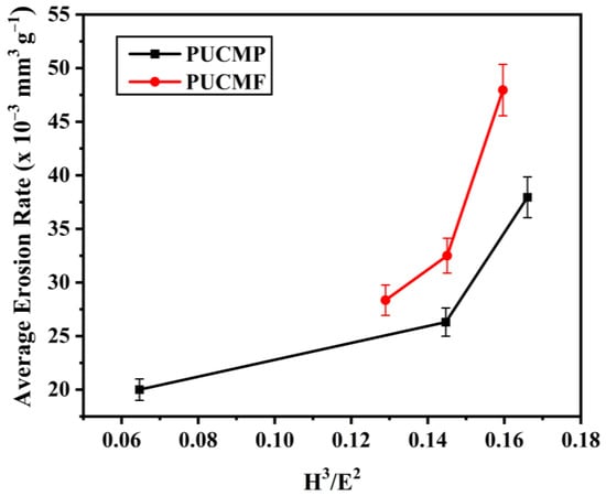 Plots of average erosion rate vs. H3/E2 of PUCMP and PUCMF coatings.