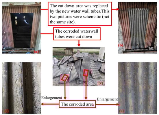 The water wall inspection during the boiler maintenance period. (a) The cut down area in water wall; (b) The repaired area in water wall; (c) The cut down corrosion water wall tubes (d) The enlargement of the corrosion tubes, I; (e) The enlargement of corrosion tubes, II.
