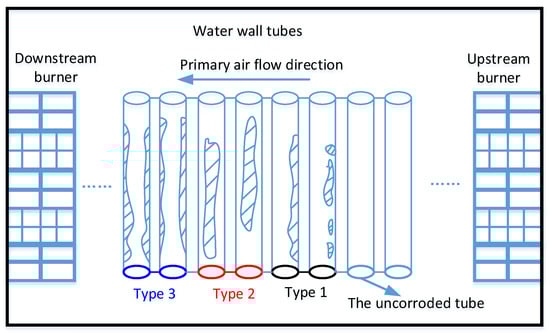 China has proposed the “Double Carbon Plan”, i.e., China would reach the CO2 emission peak before the year 2030 and carbon neutrality before the year 2060 []. To this end, the coal-fired power plants have to participate in kurtosis modulation running to release more electrical load for the new energy resources power plants, such as solar energy plants, wind power plants, hydropower stations, and so on []. Hence, large amounts of coal-fired boilers are forced to take as low as possible a load operation. For example, a 20–30% boiler rated load is a common operation condition for a boiler. Not only that, but the boiler, meanwhile, must achieve NOx emissions lower than 50 mg/m3 []. To achieve this goal, the boiler has to conduct low oxygen operations in the main combustion area to reduce the NOx emission, which makes the water wall tube suffer substantial high temperature corrosion. A direct phenomenon can be seen in the water wall tube thickness thinning, increasing the tube burst rate. In China, no matter how large the boiler unit capacity, 300 MW [], 600 MW [] and 1000 MW [] level boilers all have the tendency towards high temperature corrosion.