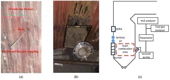 The traditional water wall tubes ambience gas sampling method is to weld an 8 mm steel tube to the membrane between the two water wall tubes, as shown in Figure 3a. The issue for this gas sampling method is that the 8 mm sampling tube no longer works once the tube is blocked by the slag. To ensure the H2S can be continually measured, a new gas sampling vent method was developed, i.e., two water wall tubes were retrofitted to ensure that the flue gas sampling tube diameter is large enough to prevent the slag blocking the sample tube, or the sample tube can be reopened by cleaning the slag. Hence, a 70 mm large diameter sampling tube was mounted on the water wall with a flange connected at the end outside, as shown in Figure 3b. The reducing ambience test diagram can be seen in Figure 3c. The CO, H2, CO2 and O2 were detected by coal gas analyzer (Gasboard 3100p), while the H2S was measured by Sulfur sentry analyzer, Event Eng corporation.