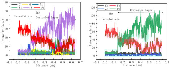 Generally, boiler high temperature corrosion caused by sulfur can be divided into two categories of H2S corrosion and sulfate corrosion []. To further ensure the specific corrosion category, the sampling tubes element line scan test was conducted. Figure 4 displayed the element distribution of the ‘no coating’ processed tube. It was seen that adjacent to the Fe substrate was the corrosion layer, with a thickness of 482 μm. An apparent characteristic is the gradual decrease in iron content and the gradual increase of sulfur along the horizontal axis distance, as shown in Figure 4a. The existence of sulfur is a typical feature of H2S corrosion. Meanwhile, the element lead (Pb) is also largely found in the corrosion layer. Along the horizontal axis direction, the larger the distance, the more the lead (Pb) content, as shown in Figure 4b. The lead (Pb) layer resulted from the PbS deposition during the coal combustion process [].