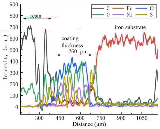 Figure 5 displayed the sample tube with the coating technology processed. Differently from Figure 4, the Cr and Ni were largely found while element Pb was not found. The elements Cr and Ni were mainly from coating material elements. The coating thickness was 260 μm. Meanwhile, the amount of sulfur was largely found in the coating layer but was rare in the substrate, showing that the existence of coating effectively prevents the sulfur from permeating into the substrate. With the aid of the coating layer, the sulfur-containing layer thickness was much reduced compared to that with no coating layer.