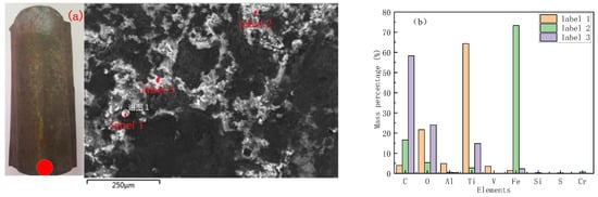 Figure 6a displayed the SEM morphology of the coating processed tube. There were many round balls with a diameter around 25 μm, as label 1 shows. The EDS results in Figure 6b showed that these round balls’ element compositions were Ti, V, Al, etc., and their metallic oxides. Label 2 elements were mainly Fe and O, which were the results of iron substrate oxidation. The major label 3 element was carbon, which was from the unburnt fly ash.
