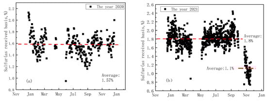 The coal sulfur comparison between the years 2020 and 2021 (The boiler was stopped for maintenance in April, no sulfur data). (a) The year 2020; (b) The year 2021.