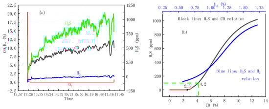 The H2S and CO curves were fitted, respectively, and the mutual relation can be obtained as the Figure 8b black line shown. Similarly, the H2S and H2 relationship can be obtained (the blue line). Fitting formulas were proposed as below, with the Adj.R-Square values of both correlations larger than 0.99.