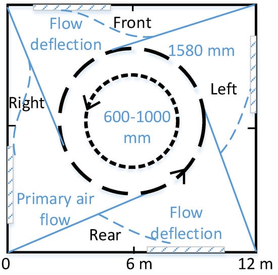 According to this formula, even taking the upper limit value of k, the largest DICPA should be 1424 mm. That means the DICPA parameter is required to be no more than 1424 mm when designing the boiler. However, in practice, the DICPA is as large as 1580 mm. When the boiler was in operation, the real tangential circle diameter was 5 to 10 times the DICPA []. Hence, the primary air flows at four corners of the boiler are apt to deflect to the downstream direction with the action of upstream current. Then, the primary air would erode the tubes in the downstream area of water walls, as shown in Figure 9. The shadow area represents the severely eroded water wall tube area due to the primary air deflection. Hence, the DICPA is too large for this boiler and results in the primary air flow eroding the water wall.