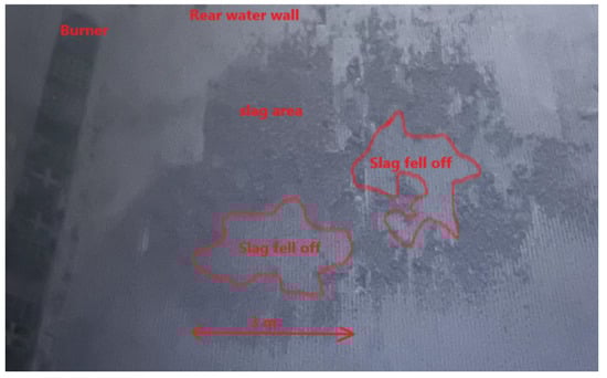 The slag adhering to the water wall tubes was a strong evidence for the overlarge DICPA. Figure 10 displayed the slag on the rear water wall during the boiler maintenance period. It can be seen that nearly the whole rear water wall was covered by the slag. The two red line areas were the traces of slag falling from the rear wall when the furnace temperature decreased during the boiler stop period. The length of one falling slag section was around 3 m. When the hot pulverized coal encountered the relatively cold water wall, the sticky coal particles in the primary air flow were condensed and adhered to the water wall. If the DICPA was smaller, the coal particles would have fewer possibilities to erode the water wall.