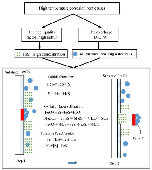According to the above discussion, the high temperature corrosion root cause included the overly high sulfur content in coal and overlarge DICPA two factors. The over-high sulfur coal incurred high H2S concentration near the water wall tubes when the boiler was in low NOx operation mode. The corrosion rate was exponential to the H2S concentration []. The higher the H2S concentration, the faster the tube corrosion rate. In addition, the overlarge DICPA resulted in the pulverized coal eroding the water wall tubes in the downstream area. The fusion coal ash would be slagged on the water wall and further increased the tube surface temperature, which boosted the corrosion to a deepen extent. As for the specific H2S corrosion mechanism, it can be seen in Figure 11. Specifically, the active sulfur atom came from the pyrite in coal. When heating, the pyrite releases sulfur atoms. Further, the sulfur atoms reacted with hydrogen to form H2S. The active sulfur atoms and hydrogen sulfide were two strong corrosive media, which could directly reacted with the substrate iron and the iron oxide layer. In normal conditions, the iron oxidation was a protective layer. According to the metal high temperature oxidation theory [], a temperature of 570 °C was a critical point. Above this value, the oxide layer was consisted of FeO, Fe3O4 and Fe2O3 with a layered structure. Under this value, the oxide layer was only consisted of Fe3O4 and Fe2O3. Considering that the boiler main stream was subcritical, the water wall temperature must be lower than 570 °C. Hence, the oxide layer was composed of Fe3O4 and Fe2O3. When the oxide layer was converted into ferrous sulfide, the expansibility differs hugely between the iron oxide and ferrous sulfide layer. When the boiler undergone rapid increase or decrease in load, the water wall temperature varied considerably. With the aid of the thermal stress action, the ferrous sulfide layer had the tendency to fall from the substrate. Furthermore, the high temperature coal particles kept on scouring and deposited on the water wall. When the particles’ weight accumulated to some extent, the corrosion layer, along with the coal particles, fell from the iron substrate. Then, the fresh iron substrate was exposed to the high temperature flue gas and the corrosion circle was restarted. The tubes were thinned after long period operation.