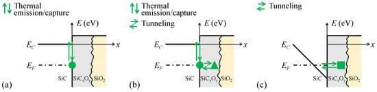 The traps positioned at the interface between SiC and the gate dielectric, with energy levels inside the energy gap, are known as interface traps. They are shown by circles in Figure 1. These defects are analogous to the interface traps at the Si–SiO2 interface. As illustrated in Figure 2a, the interface traps can capture carriers from the energy bands and emit carriers into the bands via thermal emission. These processes are modeled by Shockley–Read–Hall statistics [16,17]. Interface traps are usually quantified by their density per unit area and unit energy, labeled , to show their energy distribution.