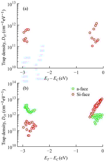 The charge pumping technique used with MOSFETs can profile the trap density in the whole energy gap. Figure 4a shows the distribution of interface traps in 4H-SiC MOSFETs [59]. It is worth noting that the interface traps in the order of cm−2eV−1 were also measured near the top of the valence band ().