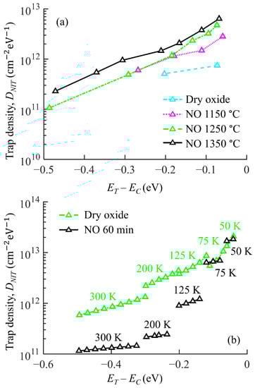 To characterize NITs near the conduction band edge in SiC MOSFETs, Hatakeyama et al. developed a method using Hall effect measurements and split C—V technique. Figure 7a and b show comparisons of the and the field-effect mobility (), respectively [68]. The highest mobility achieved by the sample NO 60 (post-oxidation annealing in nitric oxide at 1250 °C for 60 min) was ≈37 cm2V−1s−1, which is much smaller than the bulk mobility of 1000 cm2V−1s−1. It is clear from the results shown in Figure 7 that the high density of NITs is one of the main reasons for such low mobilities [68]. Moreover, similar to the results discussed previously, the is high close to the bottom of the .