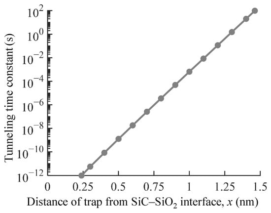 It was considered that the electrons were trapped due to thermal emission, which resulted in high density of traps, 0.06 eV below the conduction band edge, and an exceptionally wide-ranging electron capture cross-section area of cm2– cm2. However, recent studies show that the trapping of electrons by NITs is a two-step process with tunneling to and from the interface traps, and thermal emission/capture to/from the energy bands as shown in Figure 2b [66,67]. Figure 5b shows the in SiC MOS capacitors obtained using the high–low method [66]. All the curves show high density of both NITs and interface traps near the bottom of and, consequently, the thermal emission times are very short. This means that the overall time response is determined by the tunneling time in the two-step process. However, the tunneling times are also very short for the majority of NITs that are located within fractions of a nanomoter from the SiC surface. The tunneling time constant as a function of the distance from the SiC surface is shown in Figure 6 [26]. It can be observed that the tunneling time constant is in the order of s for the NITs located 0.5 nm away from the interface. Hence, low temperatures are needed to measure these traps, as measured in [66].
