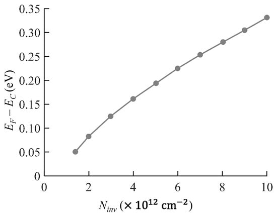 At , the Fermi level () is inside the conduction band at the SiC surface due to the quantum-confinement effect. Modeling the quantum-confinement effect, Pennington and Goldsman calculated the energy bands of P-type SiC as a function of the density of electrons in strong inversion (). The results for the position of the Fermi level in the case of (0001) 4H-SiC are shown in Figure 8 [69]. Figure 9 shows that the positions of the Fermi level () with respect to the bottom of the conduction band () are similar in the following two cases: (a) an N-type SiC in accumulation and (b) a P-type SiC in strong inversion as the P-type body of an N-channel MOSFET. The importance of this similarity is that MOS capacitors on N-type SiC can be used as representative structures for N-channel MOSFETs operating above .