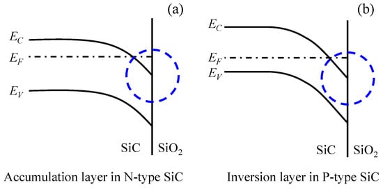 Energy-band diagrams for (a) MOS capacitor on N-type SiC in accumulation and (b) the P-type body of a MOSFET in strong inversion, showing energy-band similarity at the SiC surface.