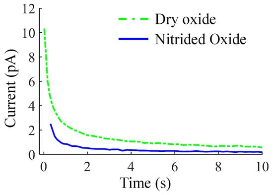 Recently, several techniques have been developed to profile the NITs with energy levels aligned to the bottom of the conduction band. The transient-current method can be used to characterize the NITs in MOS capacitors biased in accumulation by measuring transient currents through the capacitor. To measure the transient currents shown in Figure 10, the capacitor was first biased in accumulation for 30 s with the voltage high enough to position the Fermi level at , and then the bias voltage was steeped-up to position the Fermi level above . The tunneling of electrons to the NITs resulted in a transient current that was measured and shown in Figure 10 for different samples [71]. However, this method can only detect slow NITs that were further from the SiC surface, as the response times of the measured traps were longer than 20 ms (refer to Figure 6).