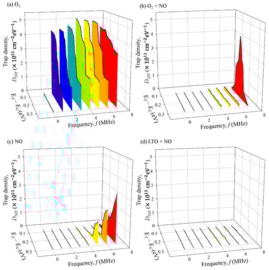 Densities of near-interface traps measured by the direct measurement technique for (a) O2, (b) NO + O2, (c) NO, and (d) LTO + NO samples. Data obtained from [73].