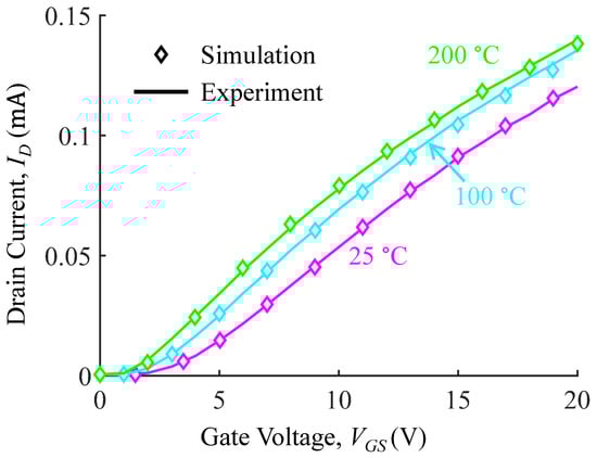 Comparison of measured and simulated transfer characteristics of a SiC MOSFET at three different temperatures. Data taken from [74].