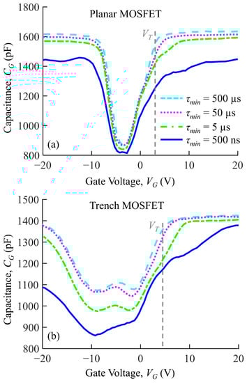 An integrated-charge technique was developed recently to profile the NITs with energy levels aligned with the conduction band [51,70]. This technique can be applied to commercial MOSFETs as well as MOS capacitors. The integrated-charge method can measure NITs active at the operating gate voltage with response times in the order of one hundred nanoseconds. To explain this method, the C–V curves of the 1200-V SiC MOSFETs measured using the integrated-charge technique for different response times are shown in Figure 13 [75]. The commercial MOSFETs with planar and trench gate structures were obtained from the same manufacturer.