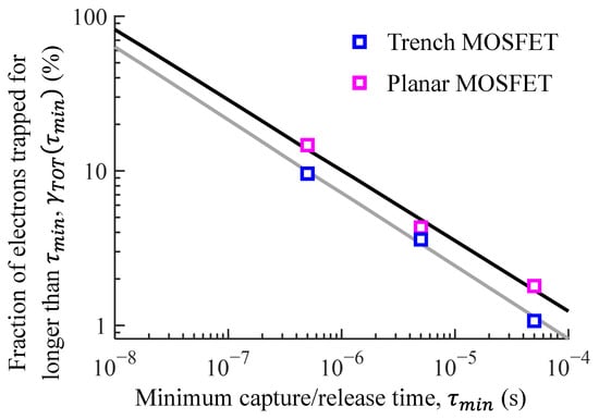 The integrated-charge technique measures charge by integrating the current flowing through the gate-capacitor of the SiC device. A trapped electron is unable to participate in the current charging/discharging the gate capacitor for the duration it is trapped, resulting in a smaller measured capacitance (). It can be observed from Figure 13 that there is a drop in with faster response times (), which corresponds to a higher density of NITs with faster response times. Figure 14 compares the fraction of the total density of electrons trapped for longer than in planar and trench SiC MOSFETs. The extrapolation of the measured data indicates that the 80% and 60% electrons are trapped for the time response of 10 ns in the planar and trench MOSFETs, respectively. Hence, the trench MOSFET will have higher channel-carrier mobility and better performance compared to the planar MOSFET at operating . These results are also in accordance with the Hall measurements, which revealed that only 20% of electrons are free at the highest gate voltages [76].