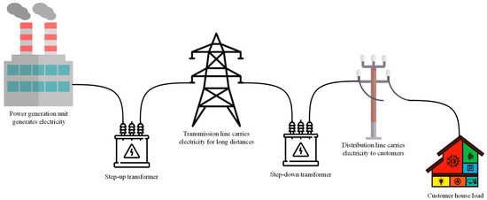 Traditionally, electricity is transported from the main power grid to utilize power to the customers. As shown in Figure 1, the infrastructure of the traditional power system consists of three different stages: (1) generation, (2) transmission, and (3) distribution. The electricity is generated in the power generation plants or units and then stepped up using step-up transformers in the transmission substation. The power is transmitted via transmission lines for long distances and then the voltage levels are reduced by step-down transformers to provide a nominal voltage level to the customers via the distribution subsections [24,25,26,27,28]. The distribution lines carry power and electricity to different customers in geological boundaries. Thus, this traditional system is centralized and highly relies on the power generation units. As a consequence, any failure in the power generation units, transmission, or distribution subsection can black out the system, causing the electricity to disconnect from a part of the system or perhaps the whole system, in turn causing power shortages for customers [27,28]. In short, traditional power systems struggle to manage any failure in the system and require a long time to fix the failure, which may leave customers without electricity for several days or weeks.