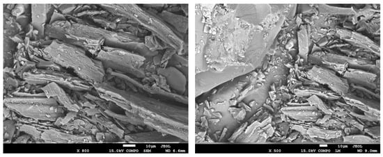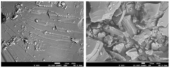 As shown in Table 1, the main difference between the two samples is the result of the petrographic analysis, specifically vitrinite and inertinite content. A strength of the conducted research is the use of solid hard coal samples in the shape of rectangular blocks. Studies in the literature on sorption phenomena of hard coal describe tests on samples in powder and grain form. The use of cuboidal coal blocks preserves the natural porosity and enables strain measurements to be performed. To show the hard coal samples studied under magnification, SEM images are shown in Figure 1 and Figure 2. They show differences in grain size and external surface texture. The apparatus used in the study has been constructed for this experiment so that sorption and dilatometric changes can be measured simultaneously. It is possible to record changes in the linear dimensions of a sample in a given time interval. This type of measurement is based on changes in the resistance of strain gauges placed perpendicularly and parallel to the layering of the coal sample. In the first stage of the experiment, sorption capacity, together with linear deformations, was measured under isothermal conditions at a temperature of 298 K. In the second part of the experiment, a manostat was introduced into the system. The modification of the measuring system made it possible to determine the dilatometric changes of the sample under constant pressure. The temperature at which the measurement was carried out was in the range of 298–323 K.
