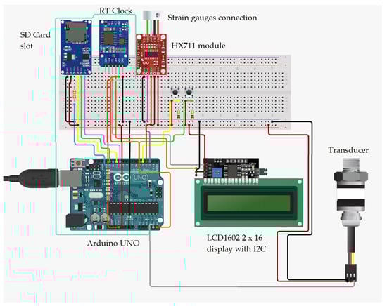 The measurements were made on a unique apparatus based on an Arduino microcontroller, which allows multiple parameters such as strain, pressure changes, and temperature measurements to be recorded simultaneously. It was built by the authors at the AGH University of Science and Technology in Kraków, Poland, and the proposed construction makes it adaptable to modifications and further improvements. In addition, a very wide library of software and the number of additional sensors allow the apparatus to be precisely adapted to the needs of the experiment performed. The implementation of the author’s apparatus, combined with the hard coal samples subjected to analysis in the form of cuboidal solid blocks of coal, which is also not often found in the literature, makes the research performed unique. The wires coming out of the measuring ampoule were connected to a microcontroller. Tensometers were placed in the circuit based on the principle of a Wheatstone bridge. The experiment used resistance strain gauges with a resistance of 120 ± 0.2% Ω and a strain sensitivity factor of k = 2.1. The tolerance of the k factor was 0.5%. From it, the signal is passed to a signal amplifier, based on the HX711 module, where the signal was converted to digital. Furthermore, the signal was sent to the Arduino UNO microcontroller. The results were recorded using the SD card reader module, and the current result is shown on the LCD1602 2 × 16 display with an I2C module. The pressure was measured using voltage S-20 transducers, which were operated in front of an additional Arduino UNO board with an LCD display. The schematic design of the device is shown in Figure 3, which includes the most important components of the device.