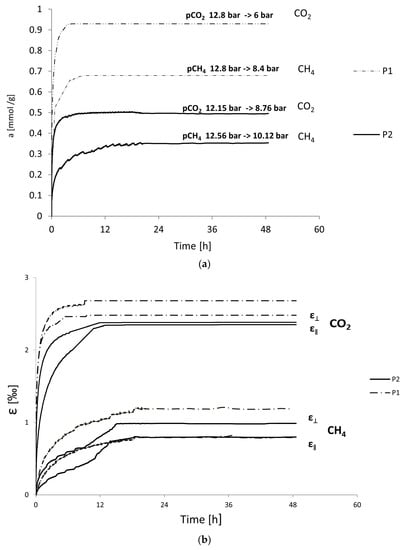 (a) Kinetics of CO2 and CH4 sorption. (b) Linear strains at 298 K for sample P1 and sample P2.