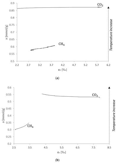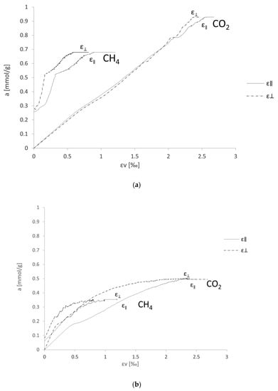 For both samples, carbon dioxide sorption involving volumetric expansion was observably higher. For P1, the maximum volumetric strain was nearly 7.5% for CO2, and nearly 4% for methane. For P2, the volumetric strain for carbon dioxide was 5%, while the strain for methane was close to 2%. The relationship between the amount of sorbed CO2 and CH4 and the sorption-induced swelling is presented in Figure 4a,b.