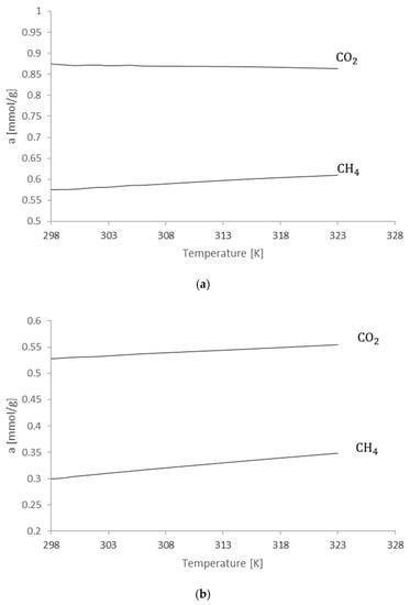 (a) Change in sorption capacity for CO2 and CH4 depending on the temperature for P1. (b) Change in sorption capacity for CO2 and CH4 depending on the temperature for P2.