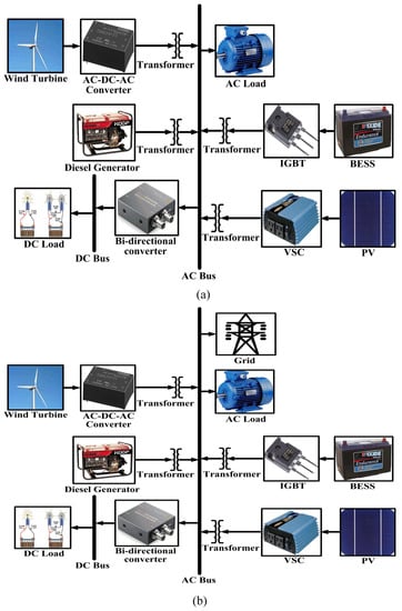 Schematic diagram of solar-wind hybrid microgrid (a) islanded and (b) grid-connected [49].