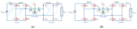 The schematics of the SAHFWPT and DAHFWPT converters are shown in Figure 2a,b. The SAHFWPT and DAHFWPT are separated into primary and secondary sections. The primary active H-bridge is designed as the high-frequency primary converter (HFPC), which is powered by the DC source voltages and for both the SAHFWPT and the DAHFWPT, respectively. HFPC work as a high-frequency phase shift inverter, generating high-frequency quasi-square wave output voltages and . The output current and are sinusoidal due to the resonating effect of the coil. Moreover, output voltage waveform level depends on switching control method, as mentioned in Table 1. The output voltage levels of HFPC by SPS and EPS switching are two and three, whereas in the control operation the HFSC have an output voltage level of two in SAHFWPT and DAHFWPT. Aside from these two switching methods, the DPS and TPS are only useful for DAHFWPT. Since the SAHFWPT secondary is uncontrolled and the resulting voltage is always two levels. The HFPC consists of four MOSFETs (). Furthermore, if we look at the HFPC schematic in Figure 2a,b, we can observe the antiparallel body diodes () of MOSFETs, that can be operated when the circulating current flow takes place. The coupled coils create the connection between the primary and secondary converter by wireless means. The secondary H-bridges is referred as the high-frequency secondary rectifier (HFSR) or high-frequency secondary converter (HFSC) according to their passive or active operations, respectively. The voltage and induced in the secondary coil due to variation in current and in the primary coil, according to the Faraday law of induction, secondary voltage serves as the input voltage source of the HFSR and HFSC and the current and flow through the secondary coil. The output voltage and of the HFSR and HFSC are applied across the equivalent load, which includes the low pass filter and equivalent battery resistance, where can be used to smooth or remove the ripple of voltage and , and can be used to smooth or remove ripple of current and . The output voltages and , as well as the currents and , are kept at the desire levels for charging the battery by the phase-shifted regulation of the HFPC and HFSC. The HFSR and HFSC are fabricated of four high-frequency diodes () and MOSFETs () with the relevant antiparallel body diodes (), respectively. The primary side’s input filter is a filter, which is not seen in Figure 2a,b.