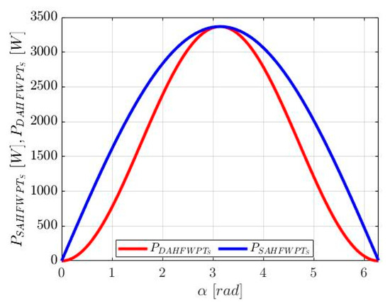 Figure 5 shows the comparison of power curve between DAHFWPT and SAHFWPT of secondary power, w.r.t α, where α is in radian. The power plotted with the red line, and plotted with the blue line are directly related with sin(α/2) as mentioned in (18), when we fixed Φ = 3π/2 for maximum power transfer condition. From the power curve, it can be proven that the power of DAHFWPT and SAHFWPT are same at α = 3.14, i.e., π. Apart from that, DAHFWPT power sinusoidal decreases and it is always less than the SAHFWPT power that decreases almost linearly. It is observed in Figure 5 that SAHFWPT and DAHFWPT have similar instantaneous power, the internal phase shift angle of secondary power of DAHFWPT is always bigger than secondary power of SAHFWPT.
