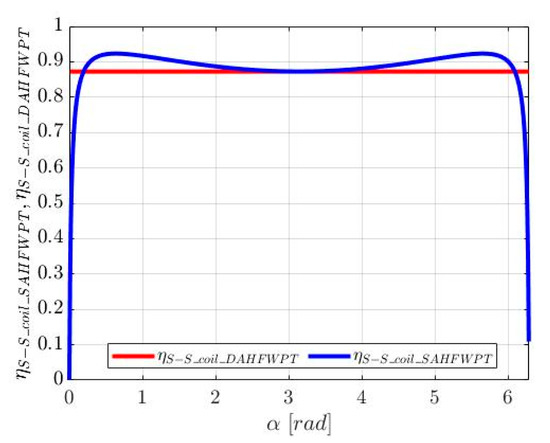 Figure 6 shows the comparison of the S-S coil efficiency curves of SAHFWPT and DAHFWPT w.r.t α. They are computed by (24) and (25), using the parameters listed in Table 4 taken from an experimental setup. The efficiency plot of is drawn in a solid blue line, while the plot of is drawn in solid red line. At α = π the efficiency is equal in both systems. The efficiency of both systems are approximately same in the range of 2 rads to 4 rads. Further with movement left from 2 rads and right from 4 rads and up to approximate 0.3 rads and 6 rads, the efficiency of the SAHFWPT is higher than the DAHFWPT. Equation (26) complies with the graph plotted in Figure 6.