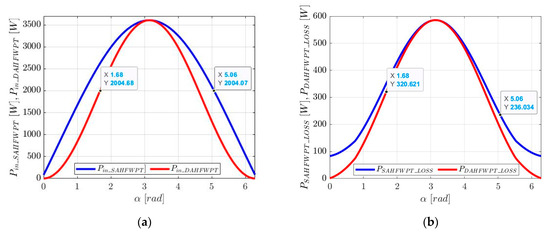 Figure 8a,b show the steady state input power and the loss curves of the SAHFWPT in solid blue line and DAHFWPT in solid red line. The input power of the system is in the range of 0 to 3600 W. As per Equation (18), SAHFWPT input power is always greater than DAHFWPT at equal apart from . Both input power and loss curve are symmetric with respect to . From the loss curve, it is visible that the losses in SAHFWPT are always greater than losses in DAHFWPT. Consequently, for the same instantaneous input power in both systems, the losses are not same. For example, at the input power equal to 2004 W indicated by data tip at and , the losses are 320 W and 236 W for the DAHFWPT and the SAHFWPT, respectively. From the above discussion and Table 5 data, it is proven that the losses of SAHFWPT are less than or equal to the DAHFWPT.