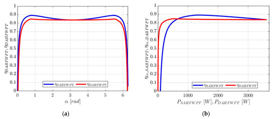 Figure 9a presents efficiency plots, i.e., in solid blue line and in solid red line as a function of the internal phase shift angle , obtained from (38) and (39) for the SAHFWPT and DAHFWPT, respectively. Both the maximum efficiencies of the SAHFWPT and DAHFWPT, i.e., 89.2% and 84.9%, are reached at , respectively. The efficiencies and have two picks at . For in the ranges from 0.73 to 2.3 and from 3.98 to 5.55 the efficiency is always greater than . Moreover, in these range of the results nearly constant. For ranging in the interval from 2.3 to 3.98, the efficiency is almost equal to .