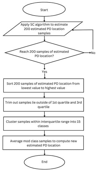 The lower twenty-fifth percentile and the upper seventy-fifth percentile of the estimated PD localization samples have a PD localization value that differs from most of the samples, making this the most robust scale for the trimming process. Table 3 depicts this process by displaying 200 estimated PD locations derived from the SC algorithm. As the first data filtering step, the first 50 estimated PD locations and the last 50 estimated PD locations were trimmed out. As shown in Table 3, any false detections will be listed in the first 50 PD and last 50 PD sample locations.